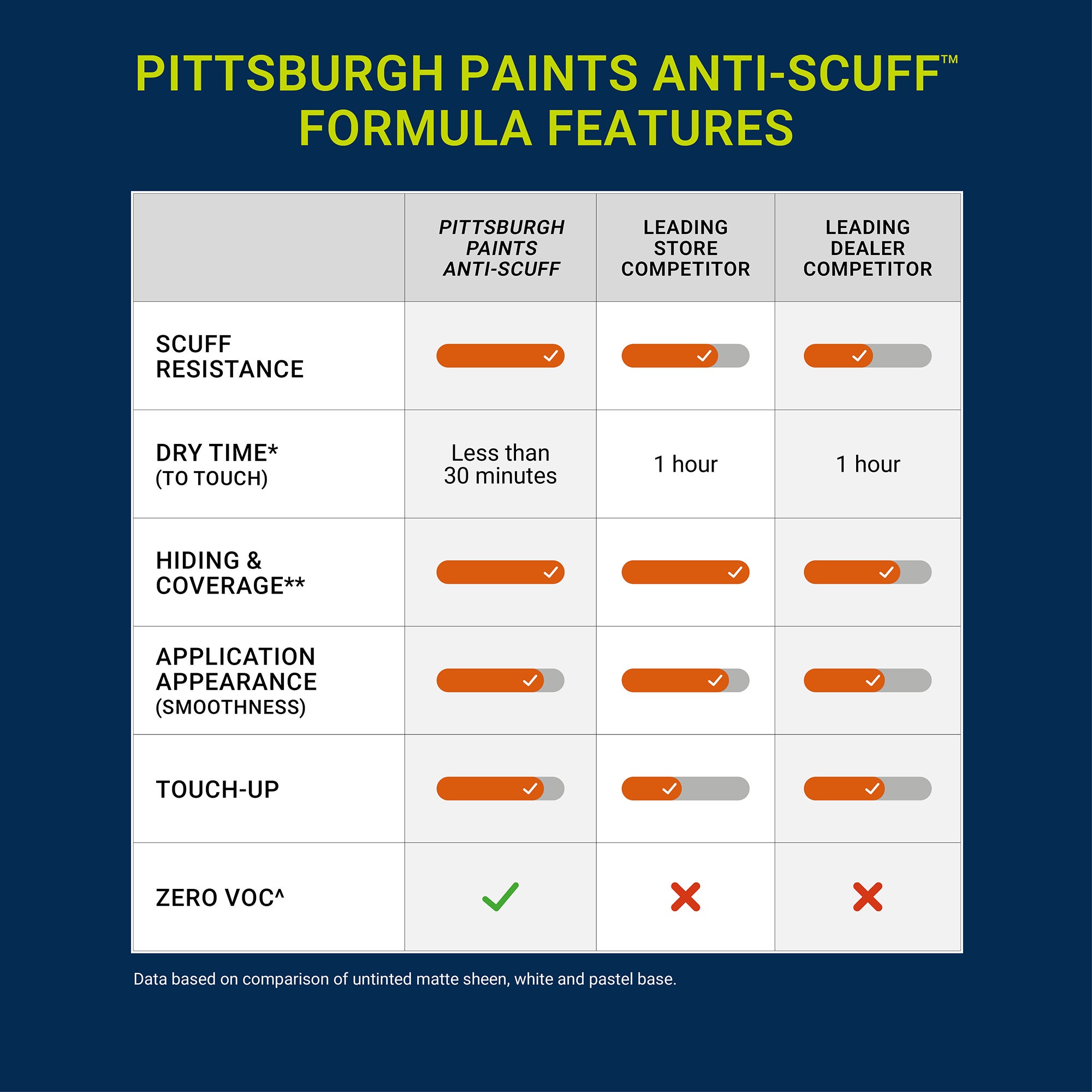 Pittsburgh Paints Anti-Scuff™ Interior Zero VOC^ paint delivers unrivaled scuff resistance across all sheens and tint bases, making it ideal for high-traffic areas in both commercial and residential spaces. It also provides a smooth application and finish, as well as high-hiding, great coverage, and excellent touch-up. It is recommended for: hallways, stairwells, offices, lobbies, restrooms, waiting rooms, fitting rooms, locker rooms, gymnasiums, fitness centers, service entrances, and more.